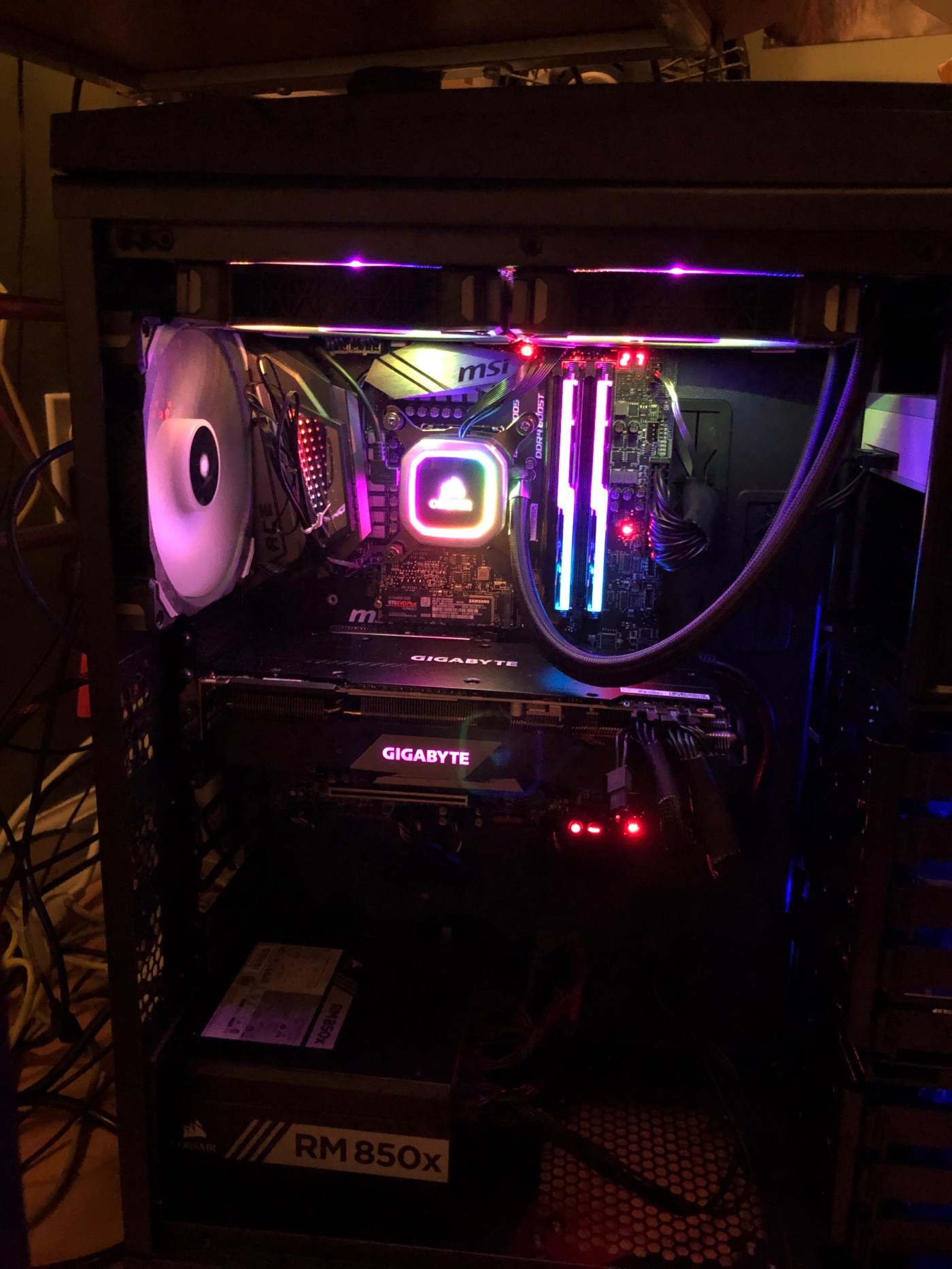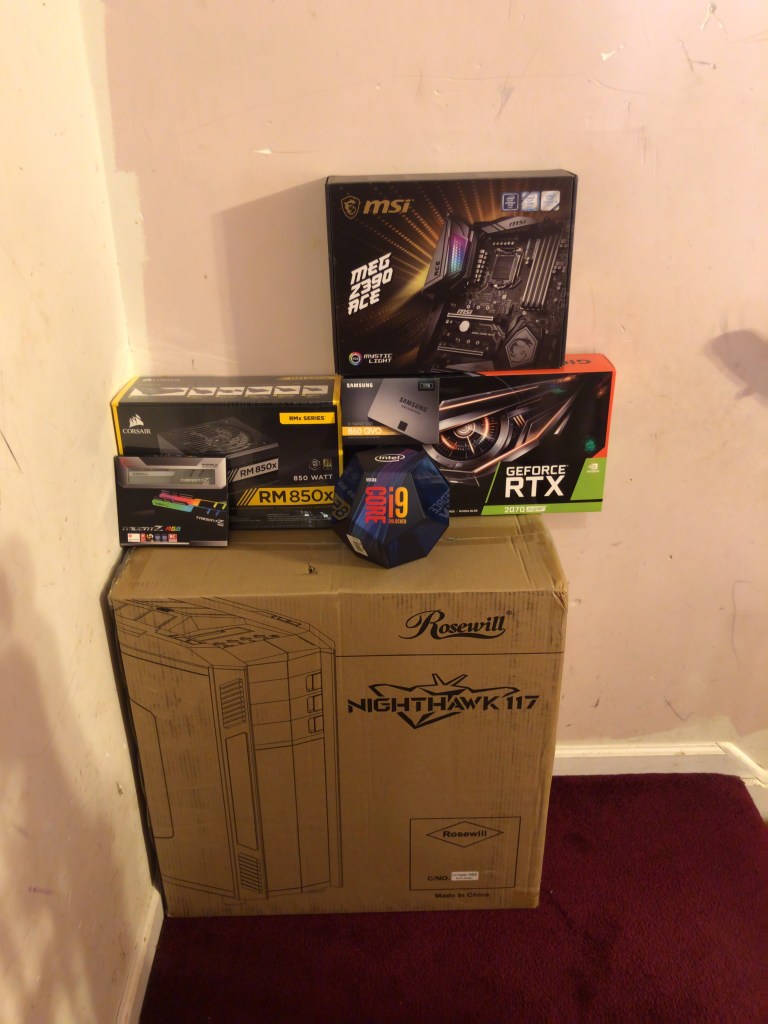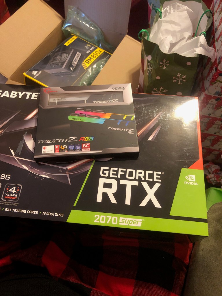 Cooler is a Corsair H115i (280mm) left over from my previous build, to keep the monster of a CPU adequately cooled. For the Motherboard: MSI MEG Z390 Ace. I decided to go with MSI again, since I was used to the bios and familiar with their products, plus it has a 13 phase VRM on the board. The RAM was the easiest to choose. 32GB G.SkiI Trident Z RGB. I had bought it off of Newegg’s black friday sale and it performs amazing. Storage: I had 2 left over storage devices from my old computer. A 3TB Hitachi Deskstar (on it’s last legs lol) and a OCZ Vertex 460A 480GB (Used as a boot drive on my old pc). In researching I bought a m.2 off of eBay for pretty cheap, brand new on auction for $80. The m.2 nvme is used as a boot drive on this build. Also, for Christmas I was gifted a 1TB Samsung QVO SSD. All in all, I have a total of about 5TB of storage. As for Graphics, I decided upon the RTX 2070 SUPER because (for obvious reasons) the budget did not allow for 2080ti and I wasn’t planning on doing 4k. However, it is an awesome card and I personally feel best bang for your buck going on the Nvidia side. I could have gotten away with a 2060/2060S, but I wanted to try my best to future proof this build as much as possible.
